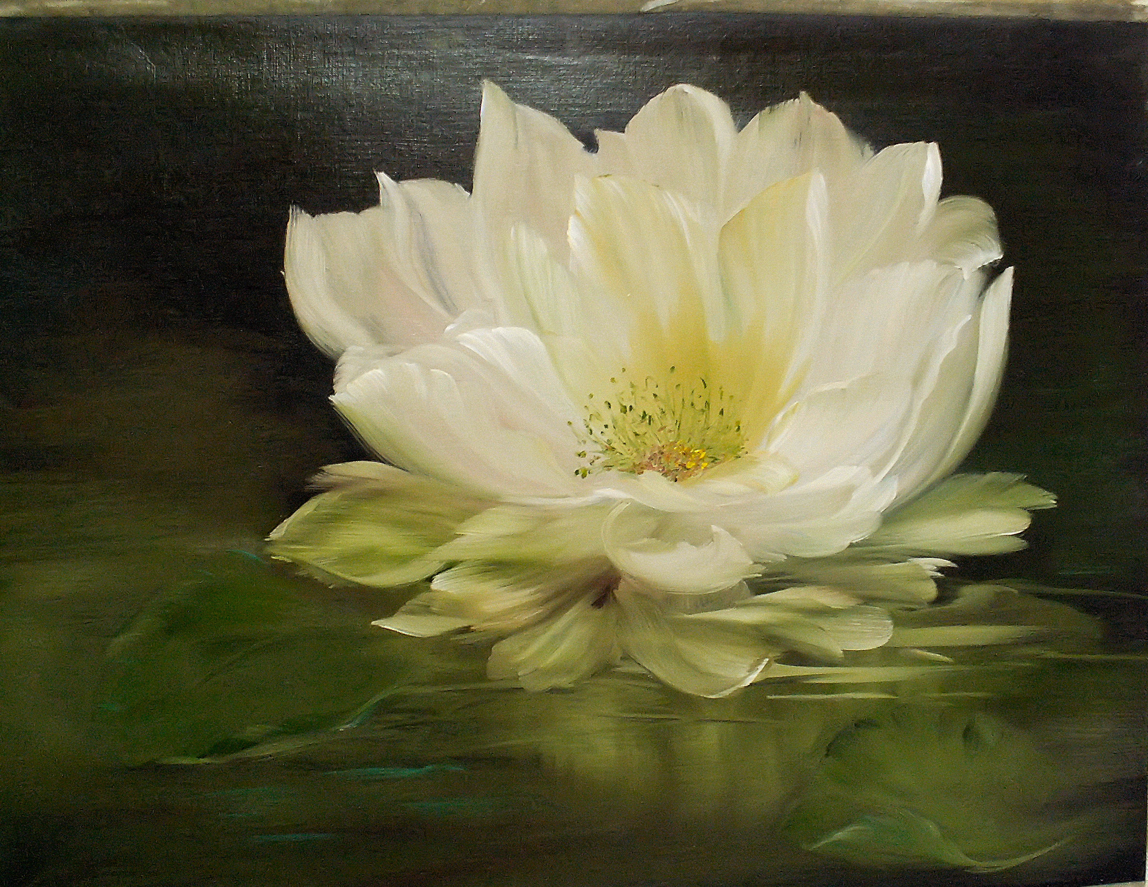 Door het aanbrengen van een dunne laag liquid white/opal blijft het canvas nat genoeg om de hele dag door te werken.